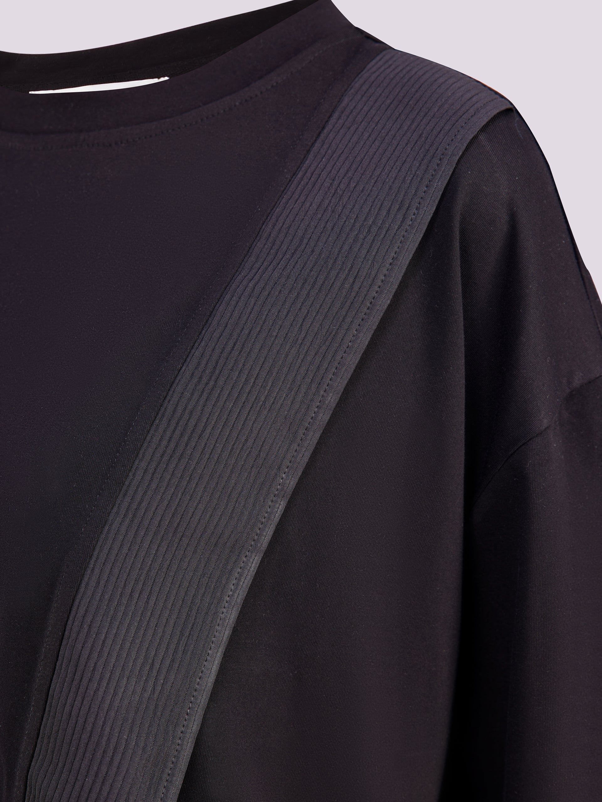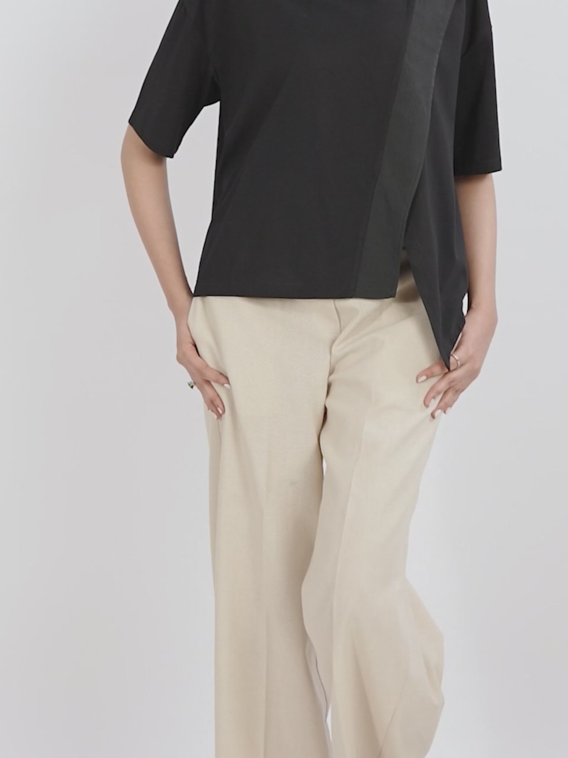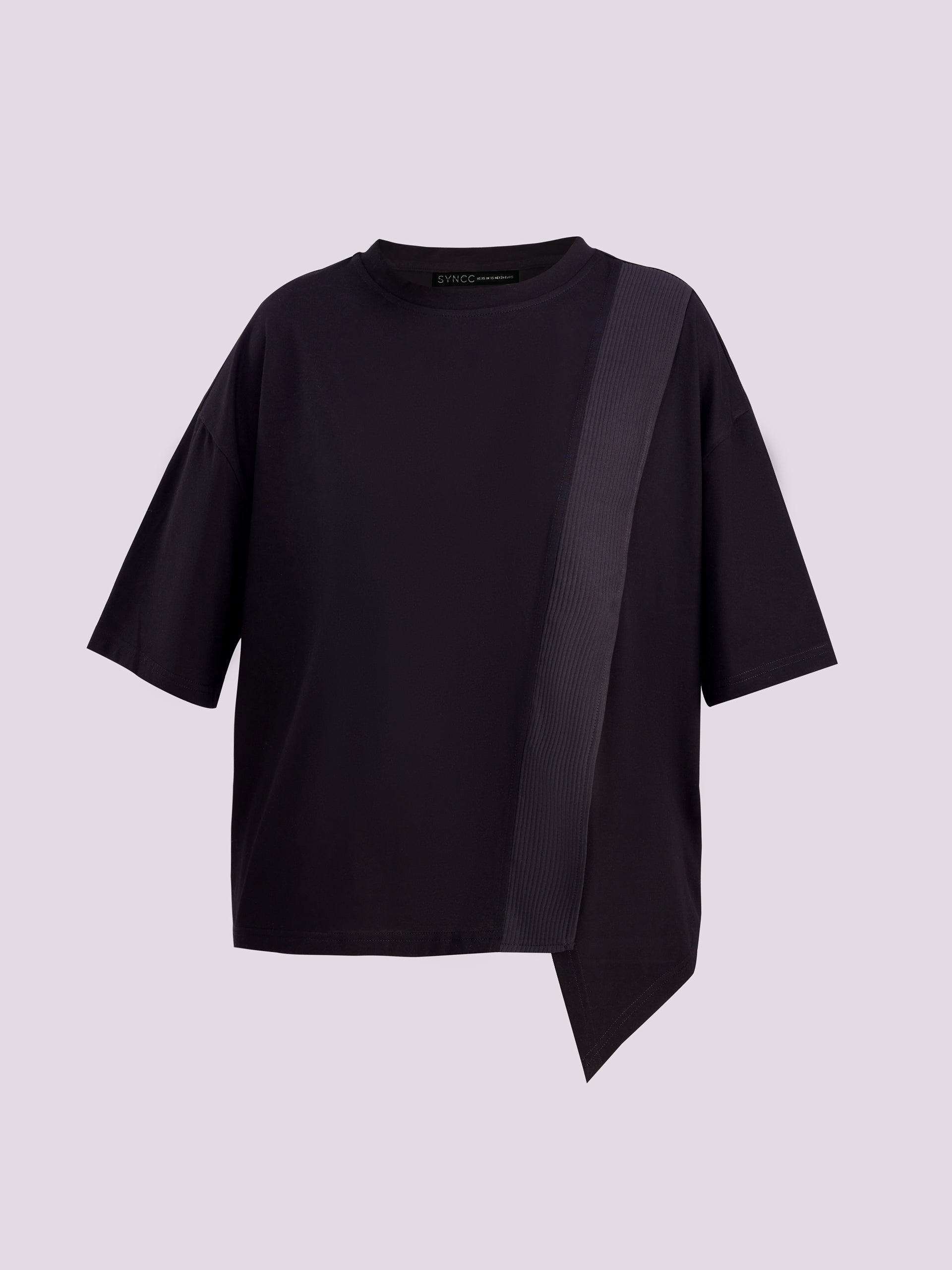 This is a relaxed fit slightly oversized tee, asymmetrical panel with fabric piece that runs diagonally across the front. Crew neck with short sleeves.