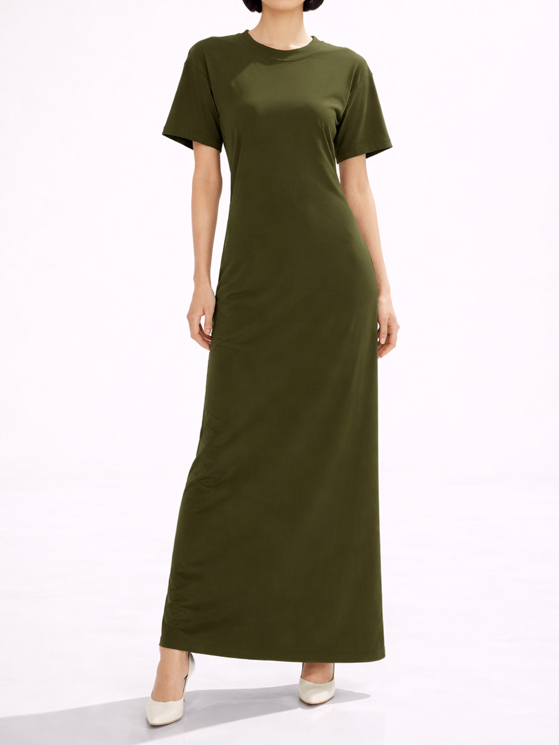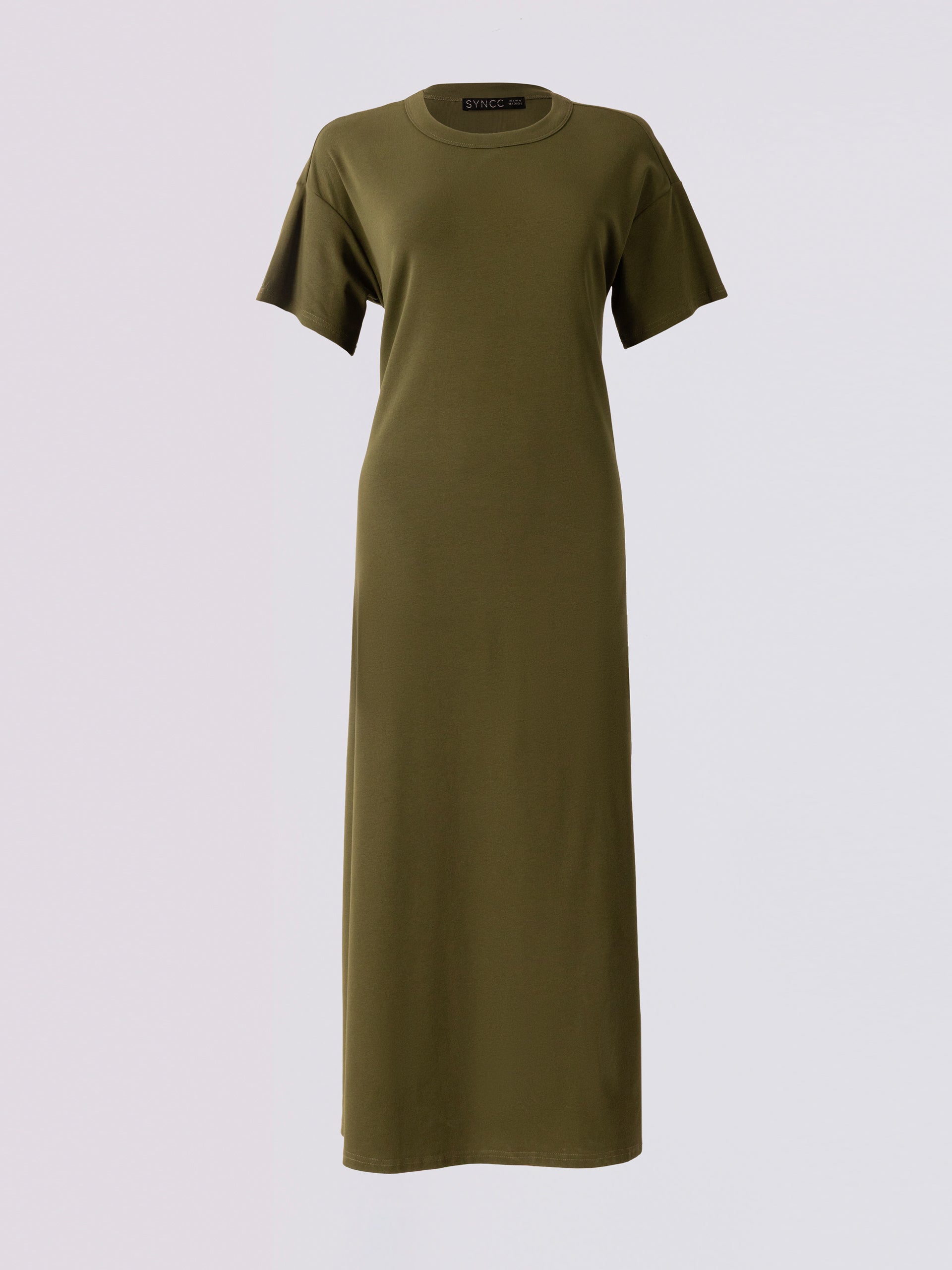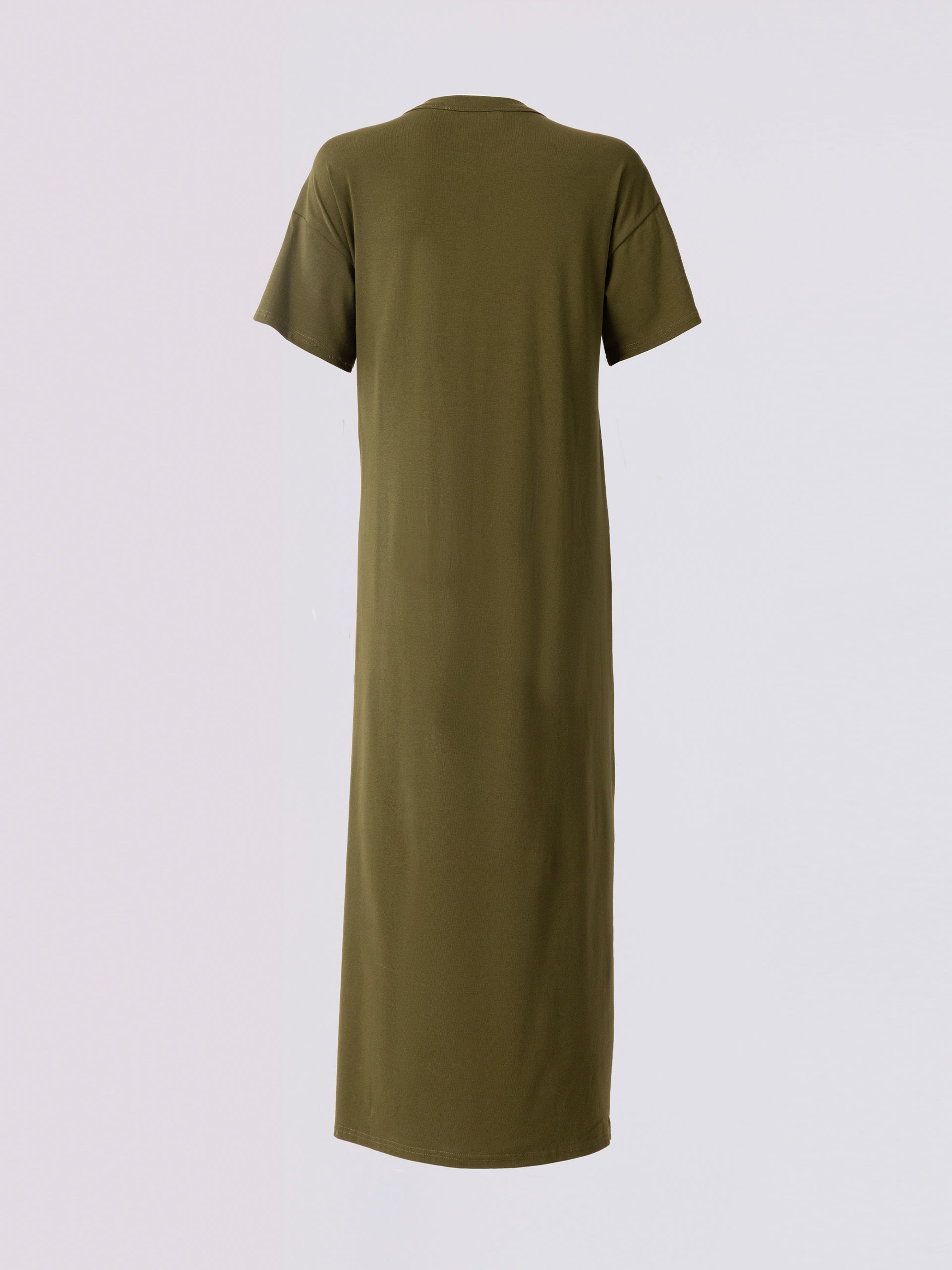 Casual elegance meets comfort in this olive long t-shirt dress, perfect for everyday wear or layered styling.