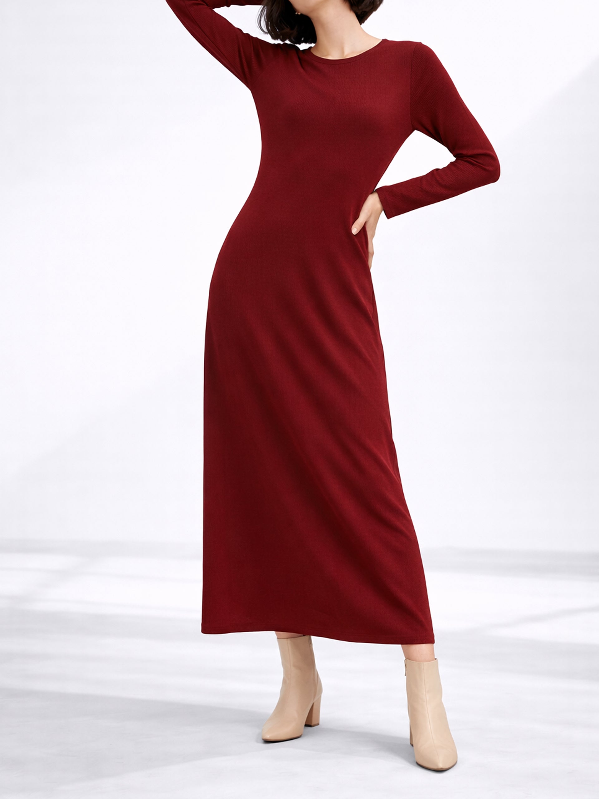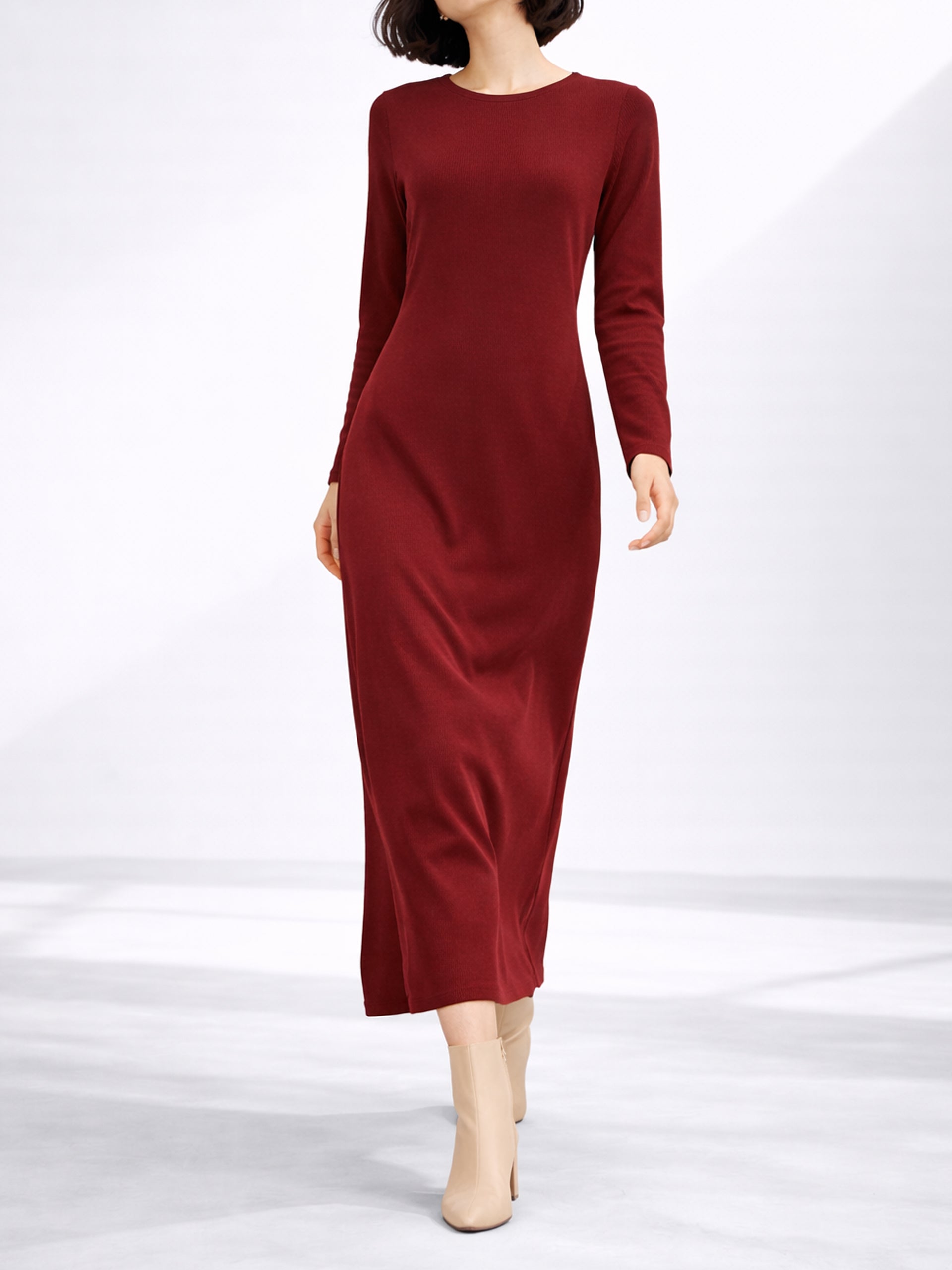 Sleek, flattering, and effortlessly chic, this ribbed wine t-shirt dress is your go-to for modern casual dressing.