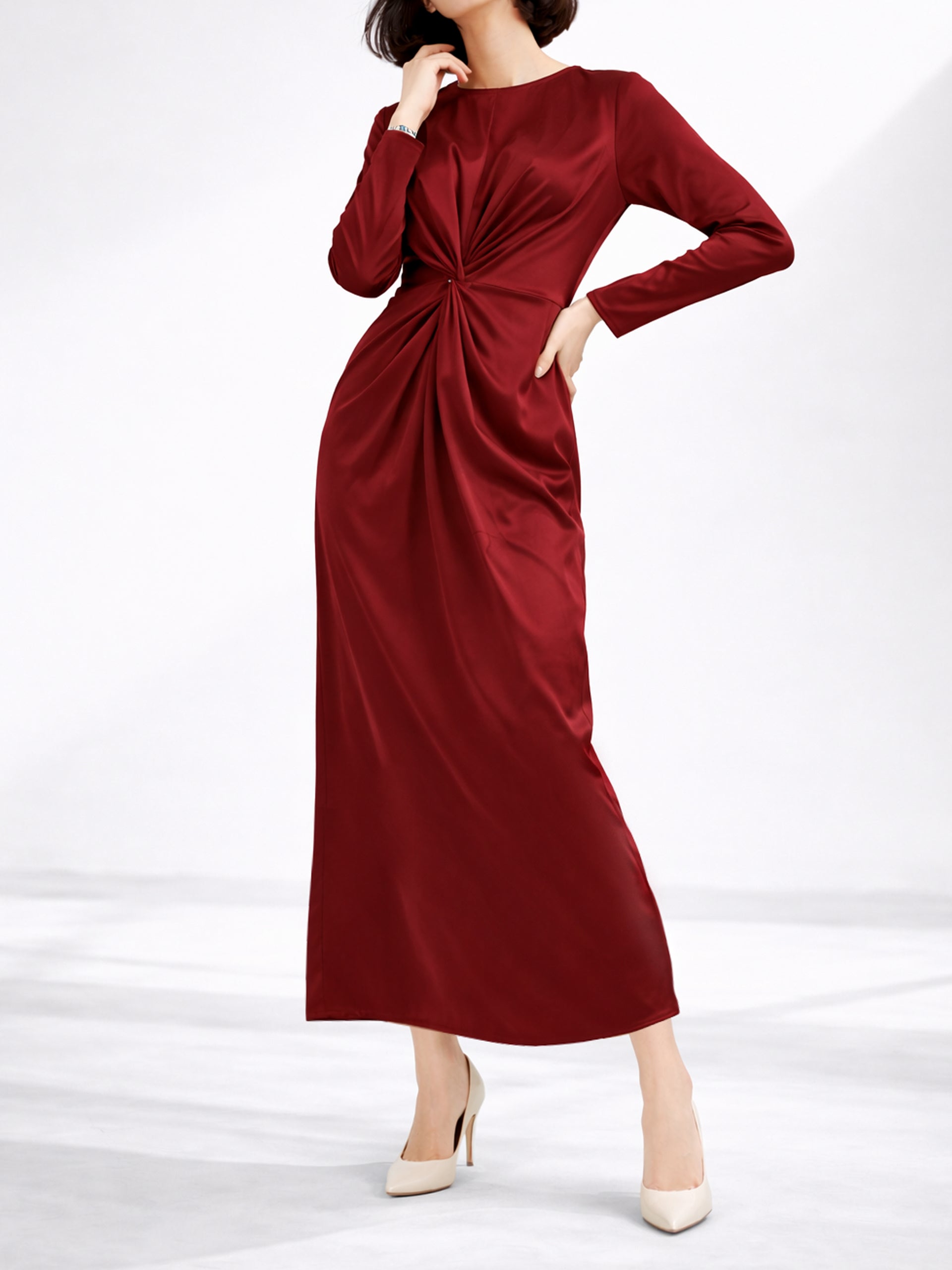 Turn heads effortlessly in this red satin draped long dress, designed for a flowing silhouette and elegant movement. Chic, glamorous, and always in season.